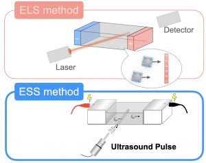 Figure 1: In contrast to electrophoretic light scattering, which uses a laser to measure particle motion, the electrophoretic dynamic ultrasound scattering (ESS) method uses ultrasound pulses.