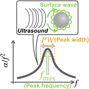 This research proposes a method to evaluate the viscoelasticity of microparticles very simply, without requiring knowledge of such rigorous ultrasonic scattering theory. When ultrasonic waves of an appropriate frequency for the particle size are irradiated, a strong resonance signal, schematically shown in Figure 2, is observed. Therefore, it has become possible to evaluate the particle’s elastic modulus G‘ and viscous loss G” using only the peak frequency (fmax) at which this signal is observed and the peak width (PW) at that frequency. This resonance scattering between the microparticles and the ultrasonic waves utilizes the phenomenon where surface waves propagating around the particle surface interact constructively.
