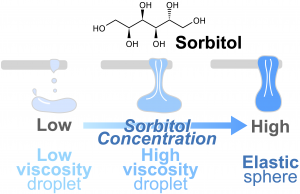 Fig.3 Schematic of sorbitol droplets becoming elastic spherical particles via low-viscosity and high-viscosity droplets
