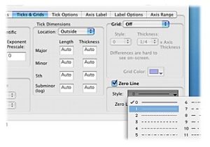 前回も利用したグラフの外観設定で、Tick & Grids タブを選ぼう。以下のように Zero Line にチェックを入れ、Styleから好きな直線を選べばOKだ。