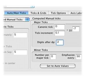 次にグラフの縦軸をダブルクリックし、Auto/Man Ticks タブを選んだ後、Auto Ticks から Computed Manual Ticksにポップアップを切り替えてみよう。以前にも説明したとおり、Set auto values ボタンを押すと、指数は自動的に -9 乗になっているはずだ。ここの設定を変えてみよう。