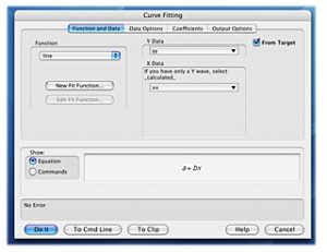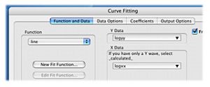 Analysis メニューから、Curve fitting … を選んで、パネルを呼び出し、組み込み関数の line を選んだら直線フィットだっ!こう思った人は大間違いだ。X軸のデータは、0.1 から 1000 まで並んでおり、プロット形式は log だが、データは log ではない。(log をとったデータなら値は、-1 から 3 だ)