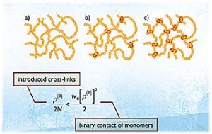 また架橋密度の臨界閾値(CST)についても論じました。ネットワークには添加したすべての架橋が導入されるわけではありません。架橋の形成速度が鎖の拡散速度に対して十分速ければ、架橋は下の図のように、溶液中で実際に鎖が隣接しているところで導入されるわけですから、架橋される数と場所は架橋前の溶液のコンフォーメーションによってすでに決まっている事になります。